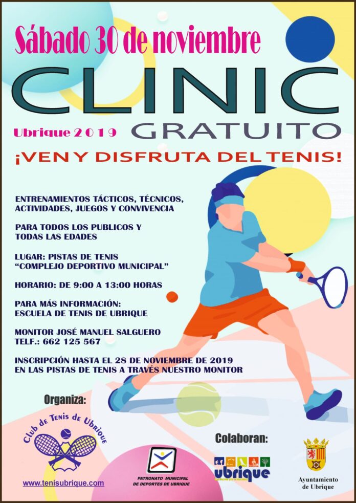Este sábado 30 de noviembre las pistas de tenis del complejo deportivo municipal acogen un clinic gratuito organizado por el Club de Tenis de Ubrique. El objetivo de esta iniciativa es pasar un día de convivencia en torno a este deporte, seguir aprendiendo y divertirse con la raqueta como elemento común.