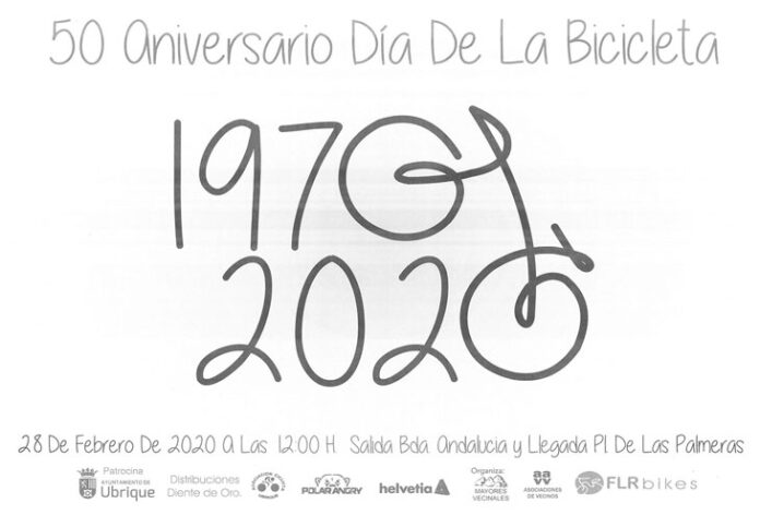 Este 2020 se celebra el 50 Aniversario del Día de la Bicicleta en Ubrique. Pese a que en un principio los datos que se tenían ubicaban el origen en 1980, Manolo Sierra ha encontrado cartelería y documentos que atestiguan que este evento viene celebrándose desde antes y que ya en 1995 se celebró el 25 aniversario.