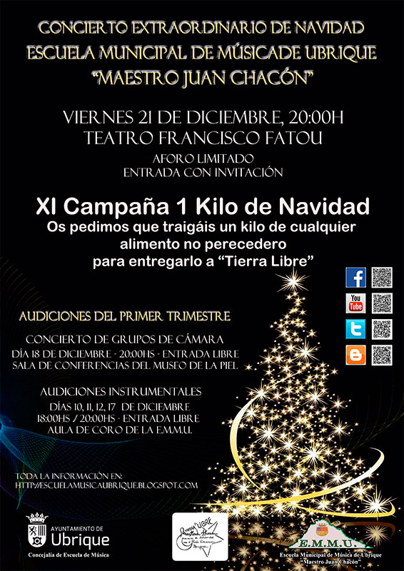 La tradicional celebración del Concierto de Navidad estará marcada un año más por su carácter solidario. La Escuela ha vuelto a invitar a los vecinos de Ubrique y la comarca a que asistan al IES Farncisco Fatou, el próximo día 21, aportando 1 kilo de cualquier alimento no perecedero. Lo recaudado irá íntegramente a la asociación ubriqueña en defensa del Pueblo Saharaui ‘Tierra libre’.