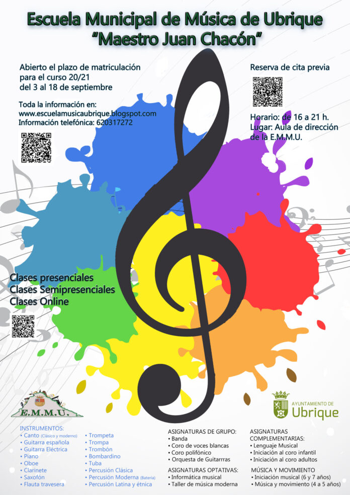 La Escuela Municipal de Música de Ubrique tiene abierto, hasta el 18 de septiembre, el plazo de matriculación para el curso 2020-21. En él, y pese a la situación en la que vivimos, se mantiene la oferta en cuanto a las asignaturas que se ofrecerán por parte del profesorado.