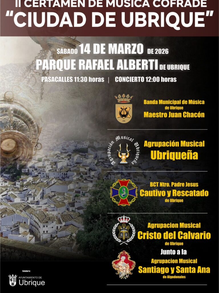 El próximo sábado, la localidad de Ubrique acogerá el II Certamen de Música Cofrade “Ciudad de Ubrique”. El Parque Rafael Alberti será el escenario donde se reunirán las cuatro agrupaciones musicales de la localidad, junto a la Agrupación Musical Santiago y Santa Ana de Algodonales, que interpretarán distintas marchas cofrades como antesala de la próxima Semana Santa.