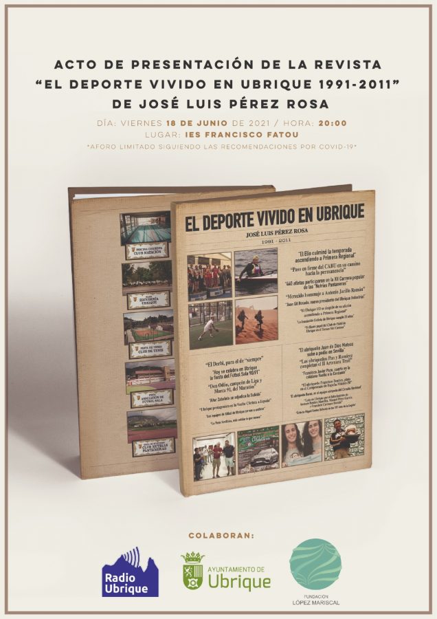 Un proyecto solidario cuya recaudación se destinará a una causa benéfica. Un homenaje al deporte de los años 90 en la localidad de Ubrique que recoge en sus más de 280 páginas un total de 1.500 crónicas de 27 modalidades diferentes. Ilustrado con fotografías de deportistas y clubes locales, el autor ha querido plasmar esa época gloriosa del deporte ubriqueño con la rivalidad en fútbol y baloncesto entre otras cosas.
