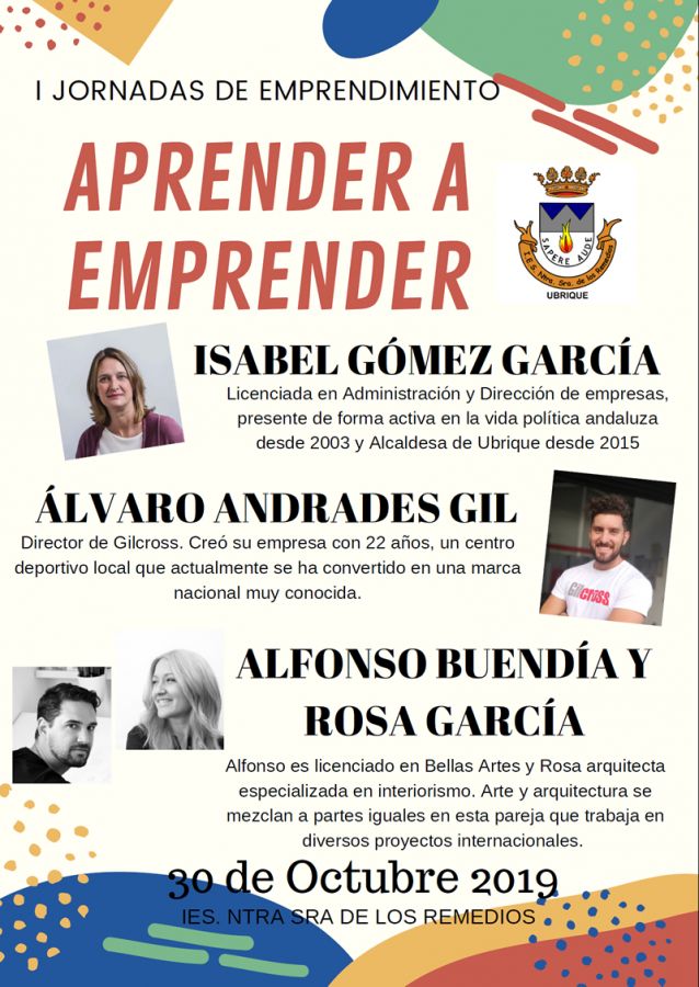 Pese a que el contexto socioeconómico actual no favorece mucho al emprendimiento, las jornadas pretenden dar a conocer a cuatro personas que, en diferentes ámbitos, han creado y han creído en un proyecto. La alcaldesa de Ubrique, Isabel Gómez, Álvaro Andrades, Alfonso Buendía y Rosa García compartirán sus experiencias con los alumnos y, posteriormente, responderán a las dudas y las cuestiones que les trasladen los oyentes, los cuales ya han mostrado su motivación a la profesora por la celebración de esta jornada.