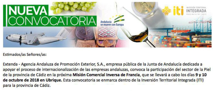 La Agencia Andaluza de Promoción Exterior, Extenda, ha convocado la participación del sector de la piel de la provincia de Cádiz en la próxima Misión Comercial Inversa de Francia, que se llevará a cabo los días 9 y 10 de octubre de 2018 en Ubrique. El objetivo es acercar a los clientes potenciales hasta la zona en lugar de que los comerciales visiten distintos mercados. De esta manera conocen in situ las oportunidades que el sector le brinda aquí. Javier Gallego, gerente de Movex resaltaba las ventajas de ello.