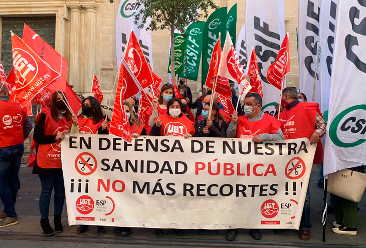En el día de ayer, UGT, CCOO y CSIF se manifestaron en la puerta de la delegación para reivindicar los derechos de los sanitarios y pedir explicaciones por esos 8 mil sanitarios que perdieron su puesto de trabajo el mes pasado.