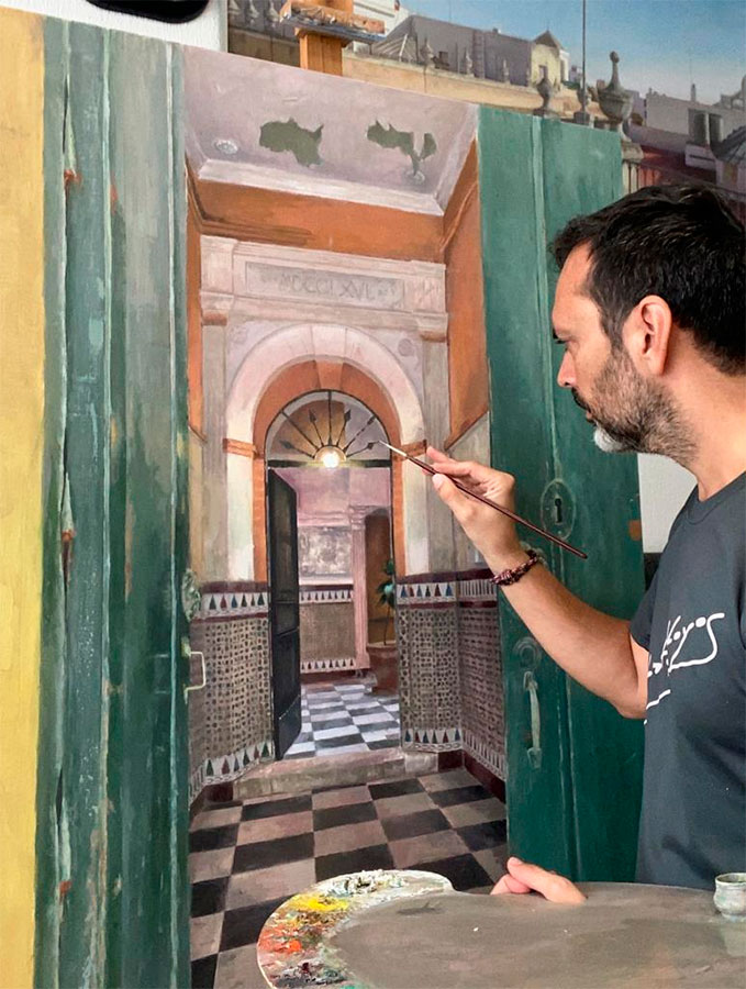 En la mañana de hoy hemos podido hablar con el artista gaditano sobre su obra. Devesa nos ha desvelado que los lienzos mostradas son «obras de estudio» con mucho trabajo detrás. Obras relacionadas con paisajes urbanos, escenas familiares o el típico bodegón sin dejar de lado un episodio de «casaspuertas».