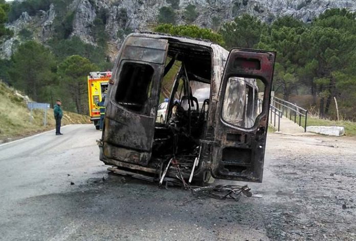 Bomberos del Consorcio de la Provincia de Cádiz en el parque de Ubrique han intervenido en el incendio de una ambulancia en la carretera A-372, a la altura de El Puerto de El Boyar en Grazalema.